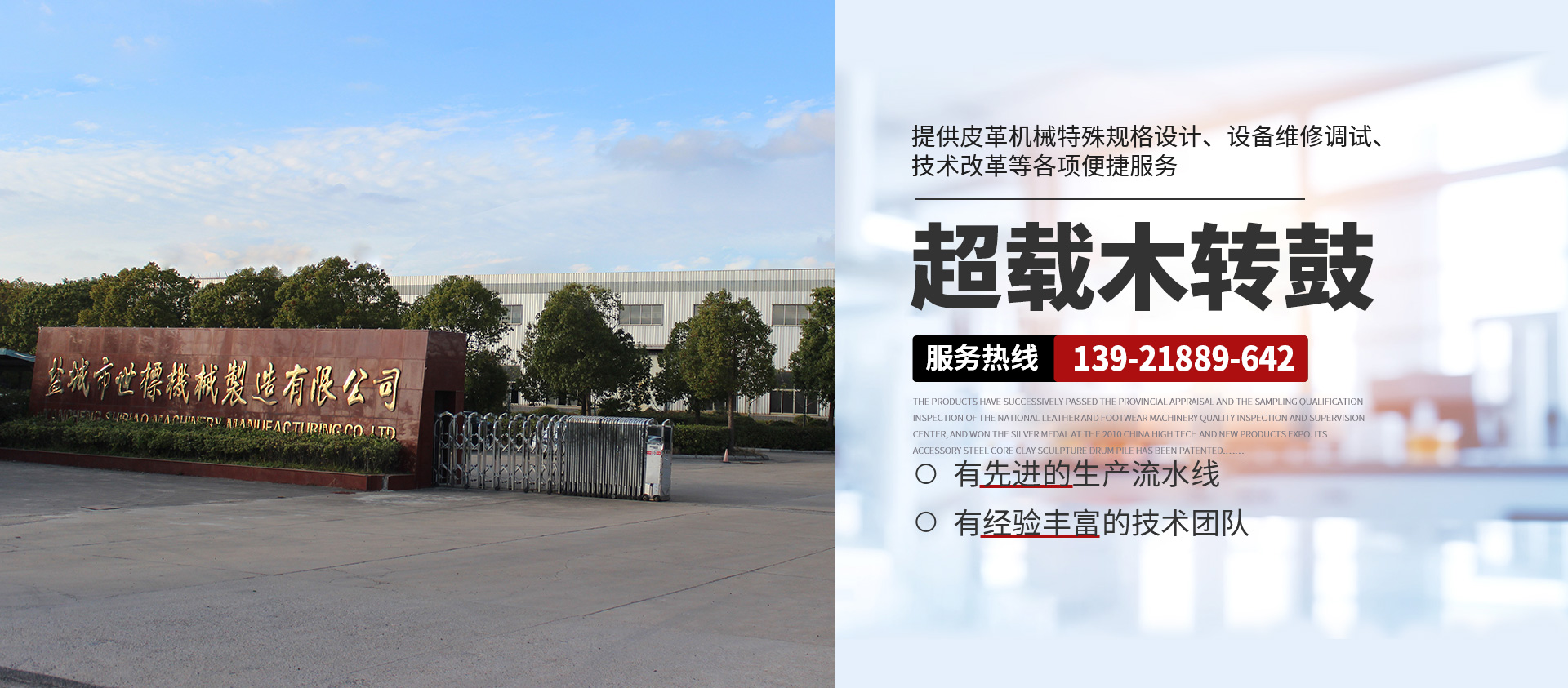 本公司常年提供超載木制轉(zhuǎn)鼓( 意大利/西班牙版本)、GJOB1-2型懸掛式木制轉(zhuǎn)鼓、鐵制轉(zhuǎn)鼓、Y型不銹鋼全自動(dòng)分格鼓、全自動(dòng)不銹鋼圓形、八角形摔軟轉(zhuǎn)鼓、PP染色等多功能轉(zhuǎn)鼓、HC系列劃槽、不銹鋼試驗(yàn)轉(zhuǎn)鼓等皮革機(jī)械產(chǎn)品,產(chǎn)品暢銷浙江、山東、廣東、福建、河南、河北、四川、新疆、遼寧等地,且遠(yuǎn)銷非洲、東南亞、南美洲、中美洲等多國(guó),深受各大制革廠家的青睞。產(chǎn)品相繼通過(guò)省級(jí)鑒定和全國(guó)皮革、制鞋機(jī)械質(zhì)量檢測(cè)監(jiān)督中心的抽樣合格檢驗(yàn),在2010中國(guó)高新技術(shù)、新產(chǎn)品博覽會(huì)上一舉榮登銀獎(jiǎng)寶座,其配件鋼芯泥塑鼓樁獲 專利權(quán)。本公司并向客戶提供皮革機(jī)械特殊規(guī)格設(shè)計(jì)、設(shè)備維修調(diào)試、技術(shù)改革等各項(xiàng)便捷服務(wù),具有健全的檢測(cè)體系和可靠的售后服務(wù)。